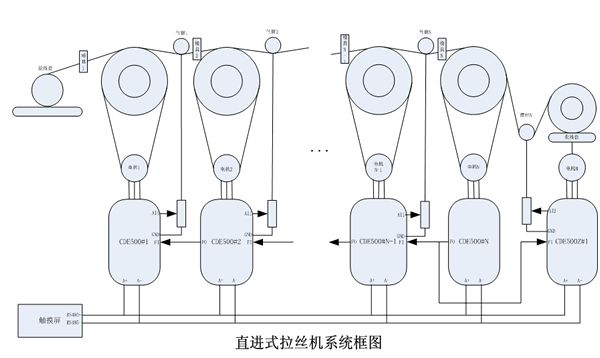 手工完成穿(chuān)模後就可以整機運行實現連續的拉伸了。直進式拉(lā)絲機通(tōng)常是由多台電機控製,經過多個(gè)拉伸模具後一次性(xìng)把原(yuán)材料拉到所需線徑大小的成(chéng)品。在(zài)這個工藝環節裏,要求電機響應速度快,線材張力恒定,張力平衡杆波動小,不斷絲不鬆絲。